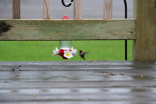 Remember those hummingbirds I was watching yesterday morning while I was drinking my coffee? Well let's just say that they are fascinating to watch! Off and on all day every time I would walk by that patio door, I would see them out there. I grabbed my camera a few different times throughout the day (and the sun even came out for a while) to try to get pictures, but those little buggers are so fast, it's tough to do.
